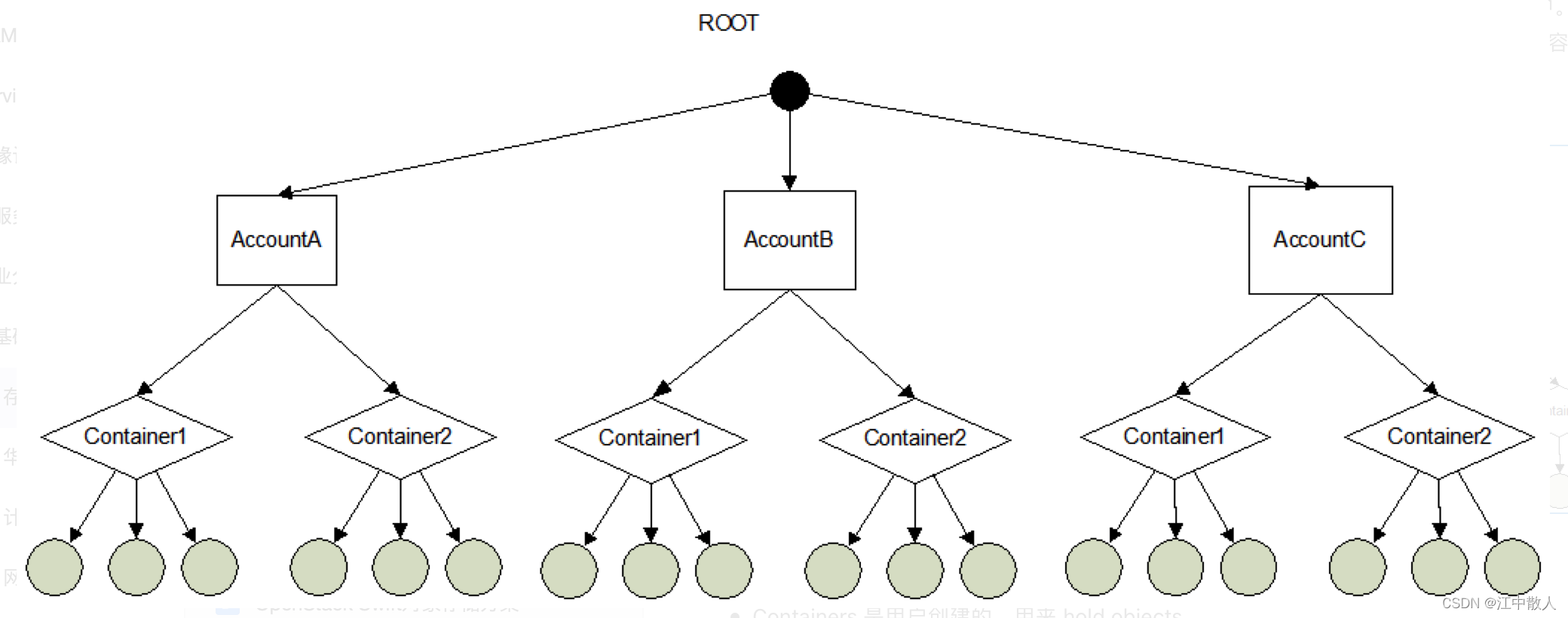 Swift采用层次数据模型,共设三层逻辑结构:Account/Container/Object(账户/容器/对象),每层节点数均没有限制,可以任意扩展: