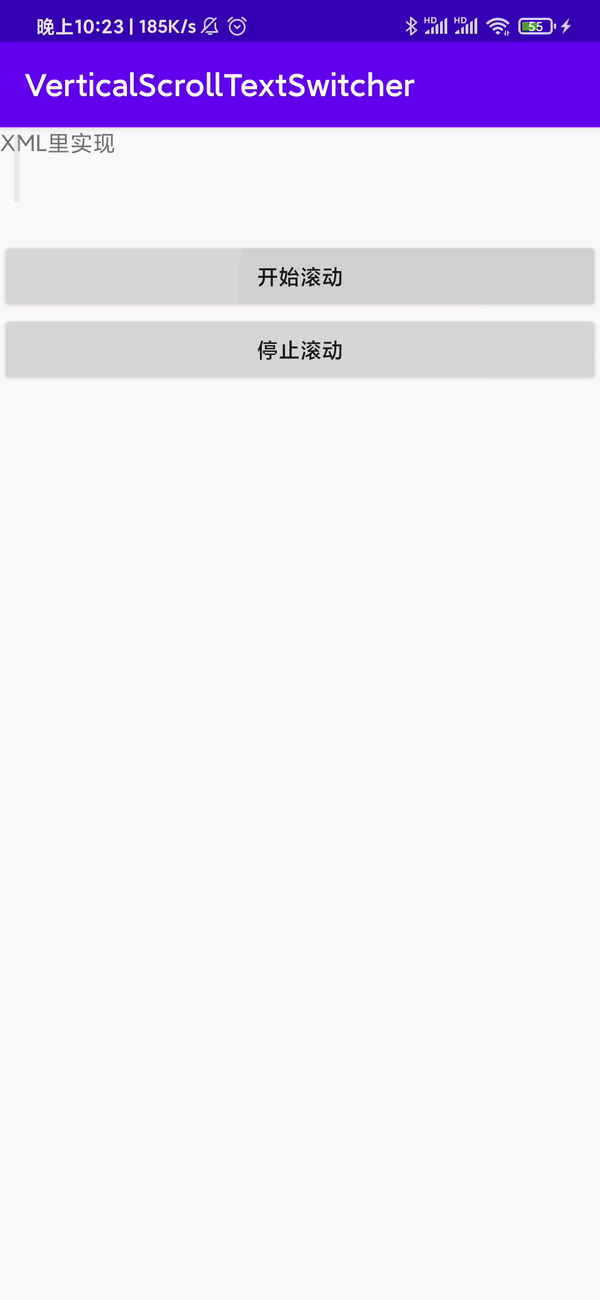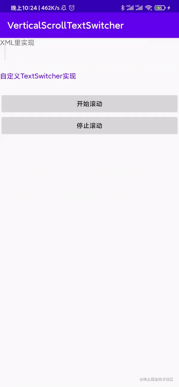setFactory()方法为其返回一个TextView,所以我们对字体的大小颜色等的控制都在这里来设置。 - 这里每隔2000毫秒就更改一次textSwitcher要显示的文字。为了实现数据的循环获取,这里通过num从0递增模除dataList的大小的方式,来获取当前数据下标,然后通过此来达到效果。
