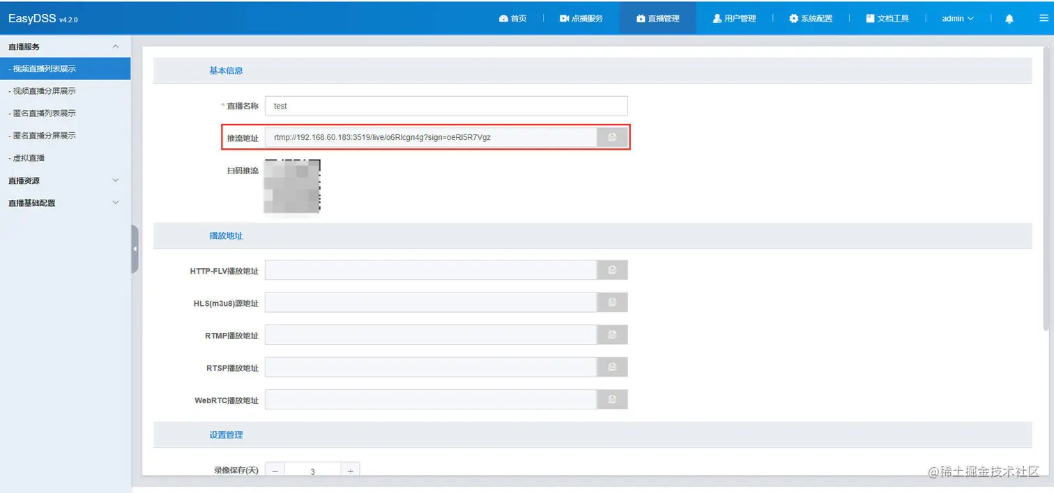 1)本地部署EasyDSS,并创建直播间,将推流地址填写到EasyRTMP中,如图: