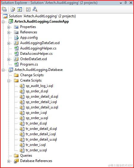我们首先来介绍Sample程序的结构(如下图)。整个Solution 一共包括两个Project,一个Console application,另一个是用以管理和定义Stored Procedure和Trigger的Database project。我们现在就来一步步实现这样一个Order management的简单的应用。Source Code从Artech.WCFService.zip下载。\