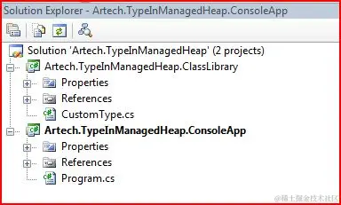 上面是整个Solution的结构,为了把CustomType类型定义在一个和主程序不同的Assembly中,我添加了Artech.TypeInManagedHeap.ClassLibrary Project。CustomType是一个空的Class,没有定义任何的成员,因为我们需要的仅仅是CustomType这个Type本身: