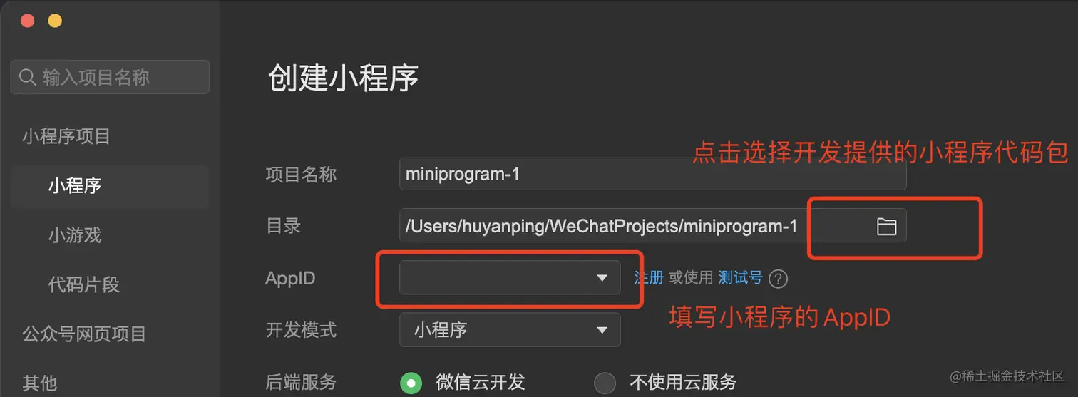 下载成功后,按照要求进行安装,安装成功后,打开微信开发者工具,使用微信扫码登录(记得提前找对应小程序的管理员给添加权限),然后打开前端开发伙伴提供的小程序代码包,填写对应的小程序AppID(一般开发提供的小程序包会自动加载,如果没有自动加载可以找开发提供)。