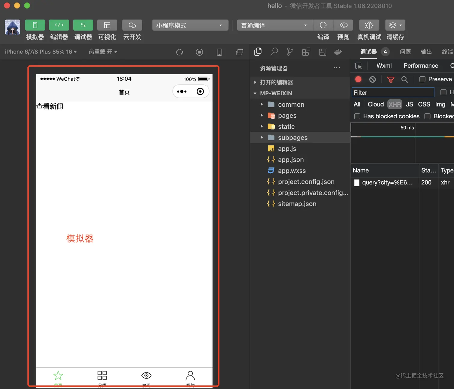 打开后,就可以看到小程序的页面了,包括左边开发者工具内置的模拟器。