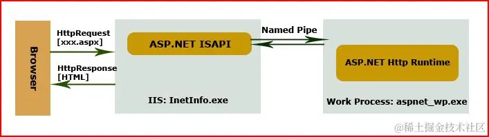 3. 最后,由于IIS和Application运行在他们各自的进程中,他们之间的通信必须采用特定的通信机制。本质上IIS所在的InetInfo进程和Worker Process之间的通信是同一台机器不同进程的通信(local interprocess communications),处于Performance的考虑,他们之间采用基于Named pipe的通信机制。ASP.NET ISAPI和Worker Process之间的通信通过他们之间的一组Pipe实现。同样处于Performance的原因,ASP.NET ISAPI通过异步的方式将Request 传到Worker Process并获得Response,但是Worker Process则是通过同步的方式向ASP.NET ISAPI获得一些基于Server的变量。
