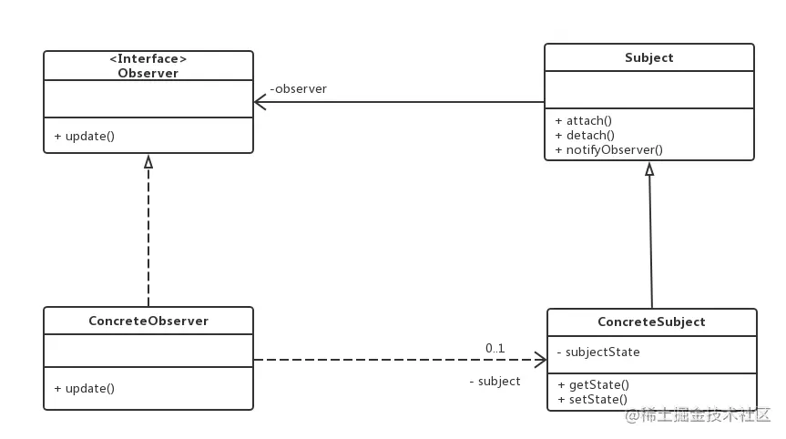 - 观察者模式没有相应的机制让观察者知道所观察的目标对象是怎么发生变化的,而仅仅只是知道观察目标发生了变化。