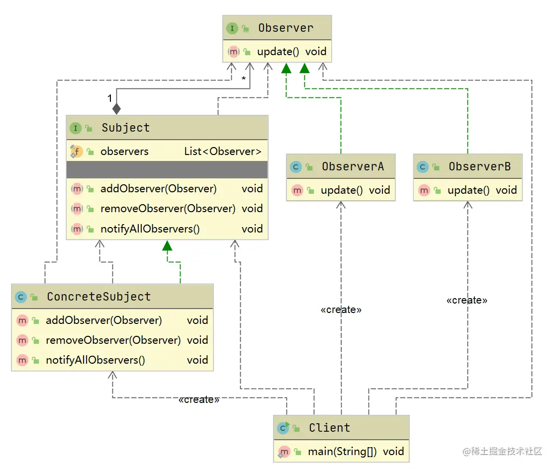 - 抽象被观察者(Subject)角色:也就是一个抽象主题,它把所有对观察者对象的引用保存在一个集合中,每个主题都可以有任意数量的观察者。抽象主题提供一个接口,可以增加和删除观察者角色。一般用一个抽象类和接口来实现。