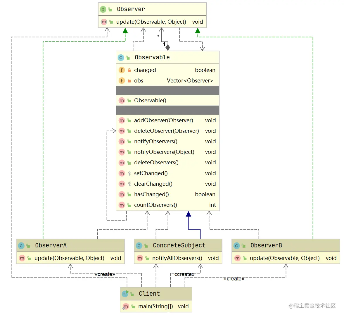 在 java.util 包中包含有基本的Observer接口和Observable抽象类,里面内置了注册、删除、通知观察者等功能。