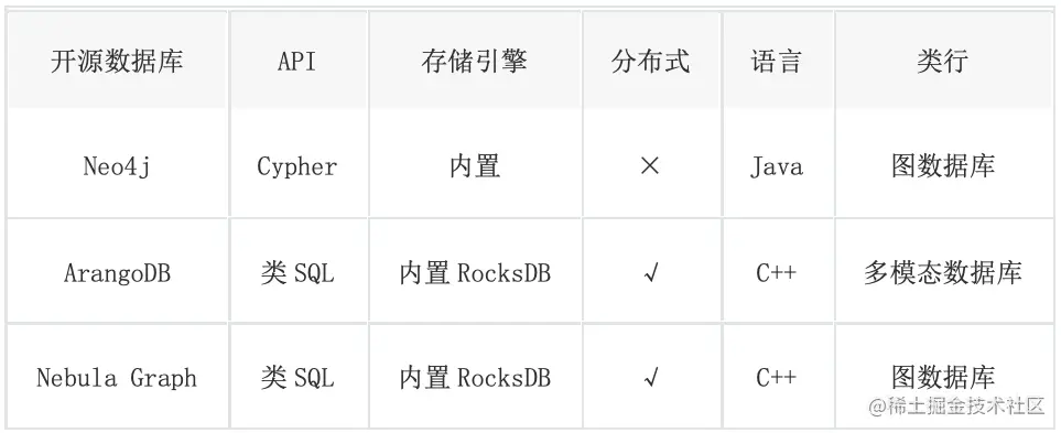 Neo4j 开源版本不支持分布式,无法满足我们对多副本的需求; ArangoDB 是 多模态数据库,支持 graph, document, key/value 和 search,支持分布式部署,查询速度快; NebulaGraph 一款是国产的开源图数据库,支持分布式部署且部署方式比 ArangoDB 更轻便,查询速度快,腾讯、京东等公司内部也在使用。