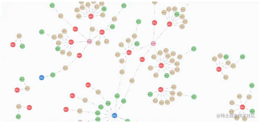 对于上述第一个时间切片中的某个系统,在图数据库中查询该系统下的所有节点构成的子图,以 “苏宁 XXX 系统”这个系统为例,查询得到在“一跳”范围内与该系统下的所有节点之间有关联的节点的关系大致如下(红色表示物理机节点,棕色表示虚拟机节点,绿色表示软件节点):