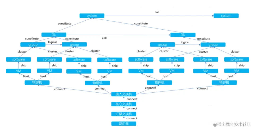 其中蓝色节点为系统,浅蓝色节点为 DU,绿色节点为 group,红色节点为软件,橙色节点为虚拟机,深蓝色节点为物理机,黄色节点为接入交换机,淡黄色节点为汇聚交换机。