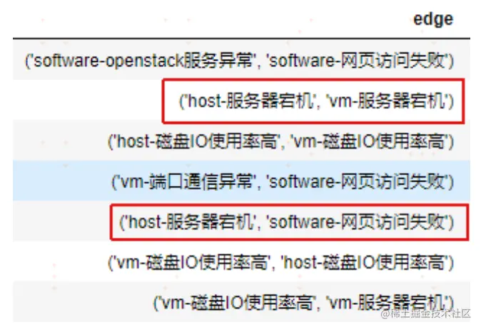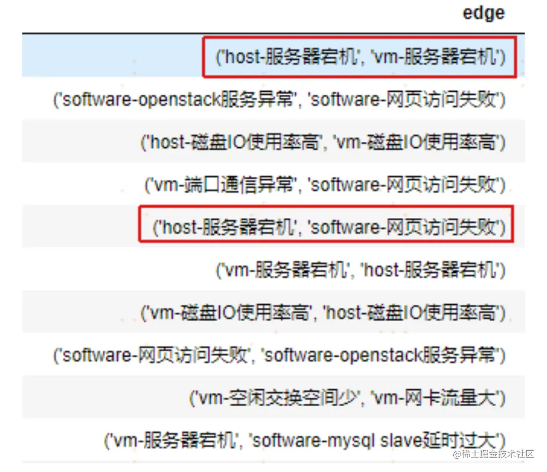 截取部分的因果边及其权重:【host-服务器宕机】导致【vm-服务器宕机】的因果边权重为 0.99。