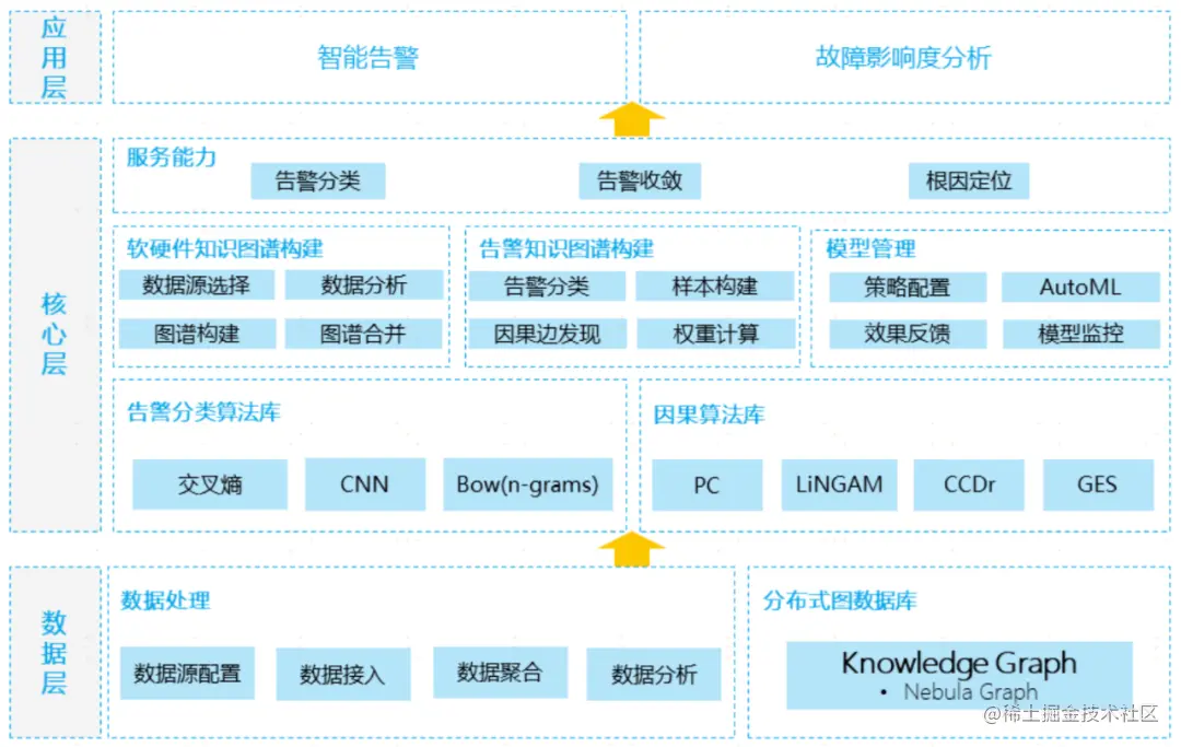 针对上述痛点,我们采用领域知识结合 AI 的方法对告警进行收敛,以缓解告 警风暴。此外,为便于一线运维人员快速的作出干预决策,我们同时对告警的传播路径和影响范围进行分析。