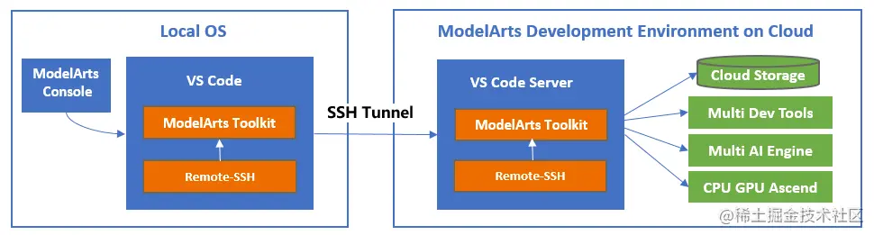 通过本地IDE加ModelArts提供的远程开发插件,用户可以先在本地做一些基础的代码编写和CPU环境的运行,当需要使用GPU等资源时,可以便捷地接入云上环境进行代码调测,云上云下无缝协同。