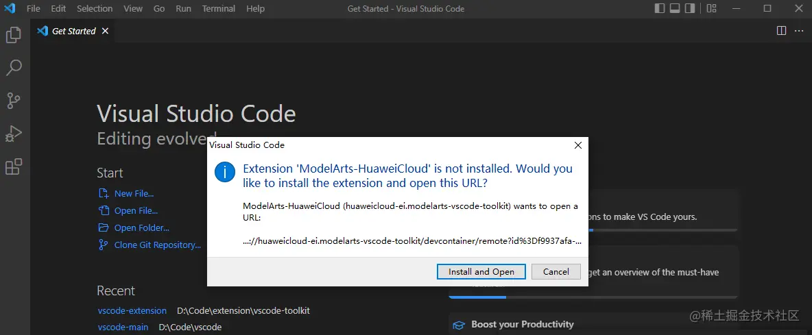 4)如果用户之前未安装过ModelArts VS Code插件,单击“Install and Open”进行插件安装