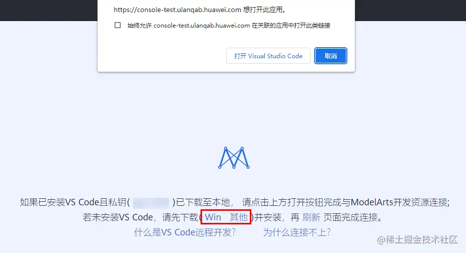 如果本地未安装VS Code,请根据页面的提示以及自己本地电脑操作系统,选择“win”或“其他”下载并安装VS Code。VS Code直接按照默认配置安装即可。