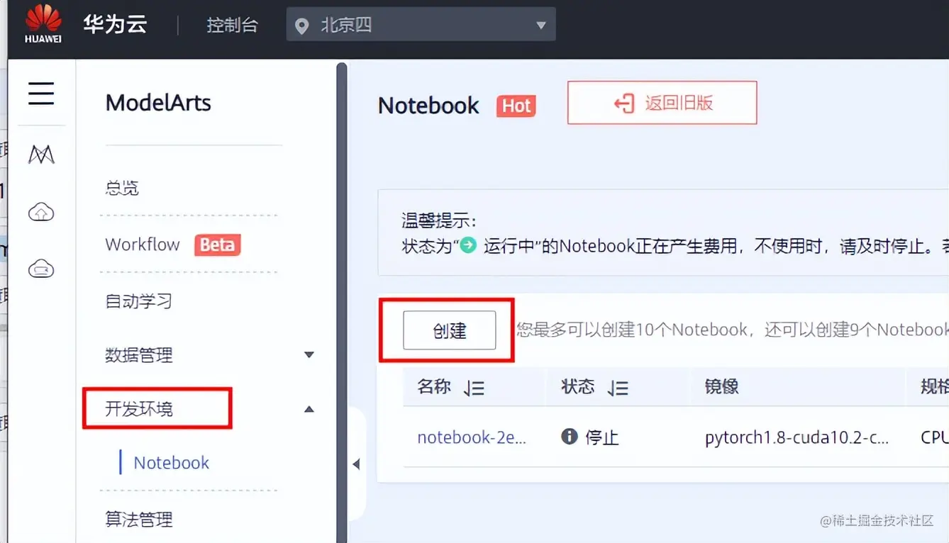 1)登录ModelArts管理控制台,创建开发环境实例