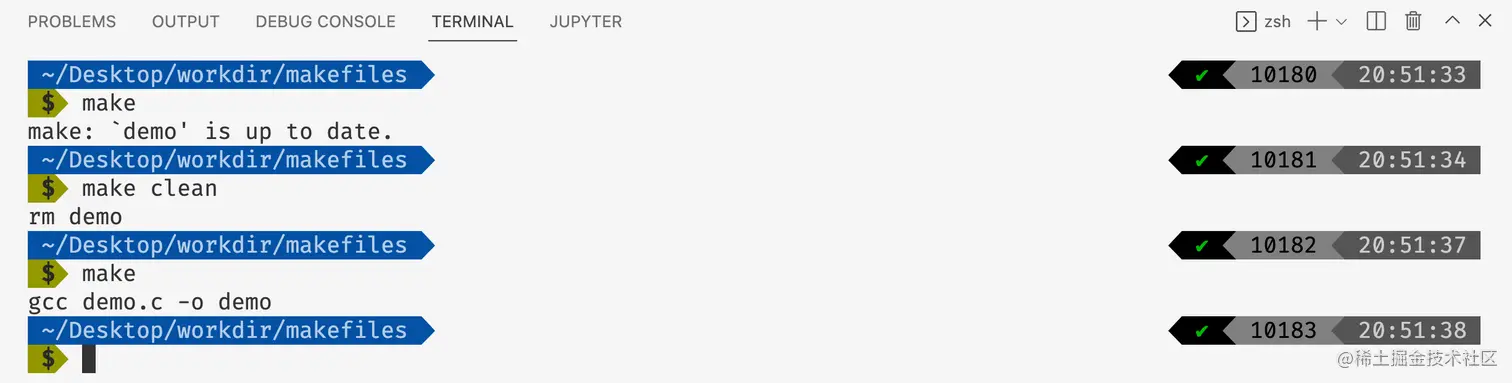 在上面的代码当中我们当我们执行make的时候寻找到makefile文件的第一个目标demo,但是因为我没有改动demo.c这个文件,而且这个文件已经编译过了,因此我们没有必要再去编译这个文件,这也是make给我们提供的一个非常好的特性,我们不需要重新编译已经编译好的文件,这在一个大型项目当中是非常有用的,当我们的项目当中有成千上万的文件的时候,如果我们重新编译每一个文件的话,那么编译的时间消耗是非常大的。因此我们在执行make执行执行clean编译目标先删除demo这个编译结果,然后在执行make这次它再找到demo目标,而此时demo已经被删除了,因此会重新编译。