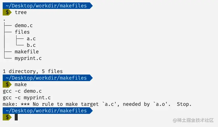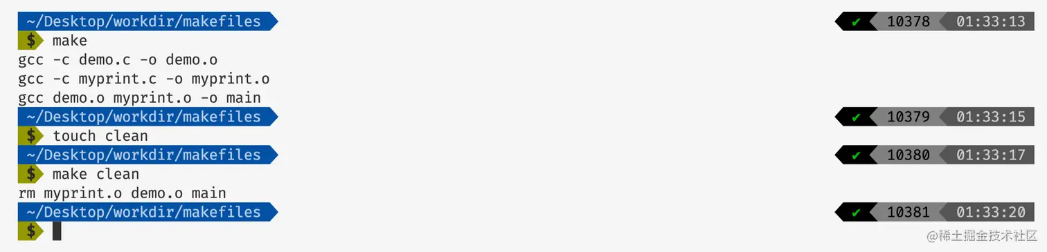 因为我们没有指定编译的目标,因此make会寻找一个编译目标,也就是main,但是在main当中依赖两个文件demo.o和myprint.o,因此make会再去执行demo.o和myprint.o两个编译目标,当这两个编译目标被完成之后才能执行main的编译,根据make的输出结果我们可以得到这一个结果的印证。