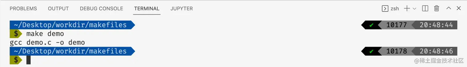 然后我们使用make命令去解释执行makefile,我们可以使用make 编译目标去执行特定的语句,比如在上面的例子当中我们执行make demo的话就会执行gcc demo.c -o demo命令。