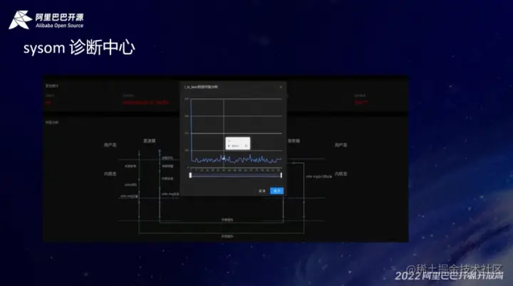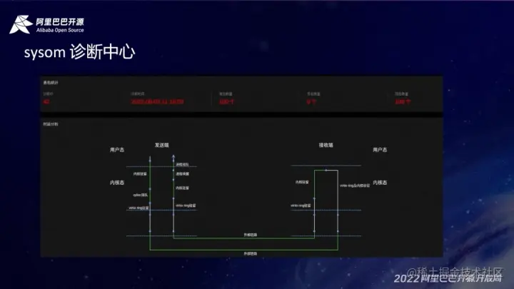 SysOM 比较有亮点的两个功能:网络诊断和 IO 诊断。我们现在从单时报能看到的是网络诊断,通过从 server 端发包给 agent 端,然后把整个调用链,在每个阶段平均的耗时计算出来,通过一个直观的图展示出来,也可以通过鼠标的悬停去看具体的某个阶段的耗时情况做一个下转式的分析。比如下图对用户态的整个内核的实验做了分析: