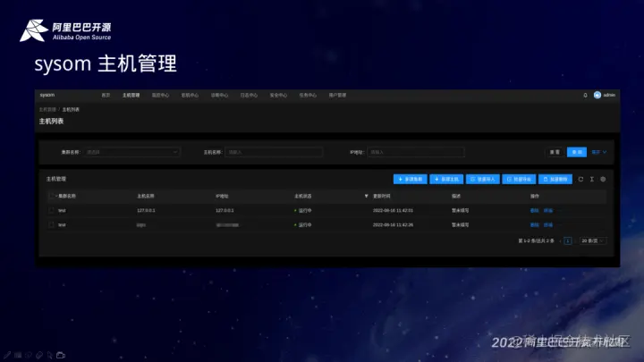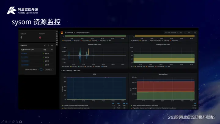 SysOM 主机管理,支持批量导入导出、集群化管理,当然也支持远程的终端。监控中心集成了一些常用的资源的配置项。比如说磁盘、CPU 算力,还有网络带宽的使用情况,也包含一些关键进程的监控,还有网络的延时情况。