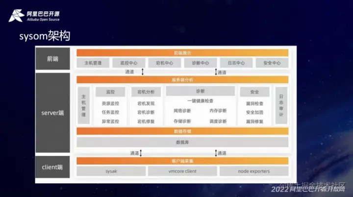 client 包含 SysAK 负责提供系统的性能和故障诊断。vmcored client 主要是负责提供诊断信息的收集。node exporters 负责整个资源的一个诊断,还包含时序化的处理、回传 prometheus。