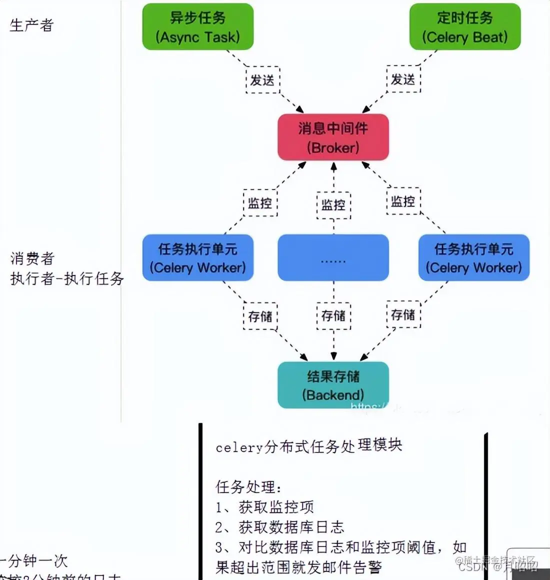 Worker:执行任务的单元,它实时监控消息队列,如果有任务就获取任务并执行它。