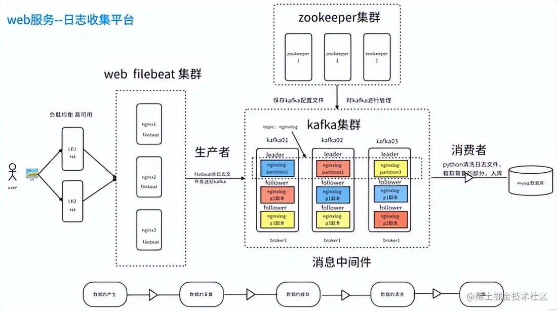 项目描述:分别使用3台Linux服务器来作为nginx集群搭建前端web服务,kafka集群和zookeeper集群,2台Linux机器做反向代理集群。通过filebeat收集前端nginx集群的访问日志,统一存入kafka集群平台,部署zookeeper集群来对kafka进行配置管理,通过python编写消费者对nginx的log日志做数据清洗,获取流量信息存入mysql数据库。