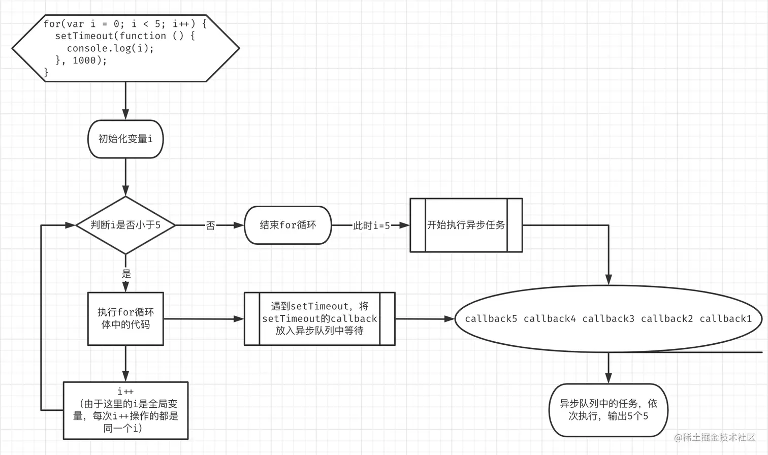 for循环是同步的,setTimeout是异步的。这里会生成5个setTimeout,每个setTimeout的callback都会先放到异步队列中去,等到for循环同步执行完之后才会依次执行。