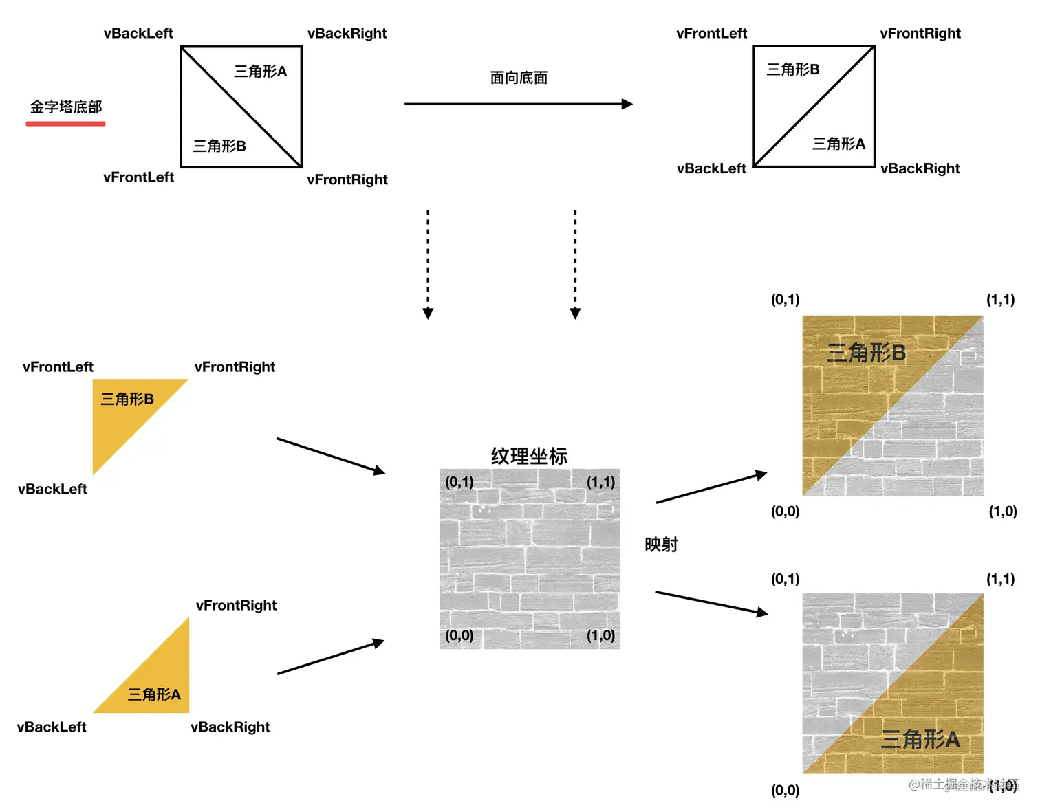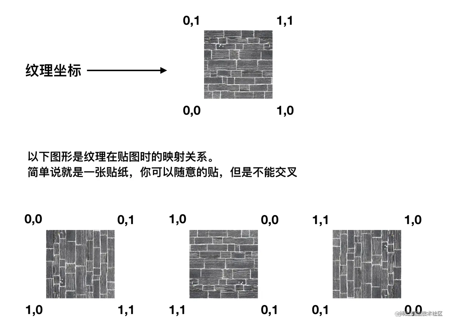 总体上说,通过为每个顶点指定一个纹理坐标而直接在几何图形上进行纹理贴图的。纹理坐标要么是指定为着色器的一个属性,要么通过算法计算出来。