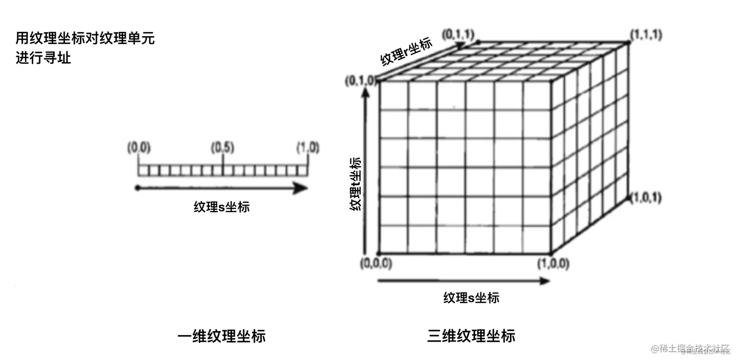 纹理坐标命名为s、t、r和q(与顶点坐标x、y、z和w类似),支持从一维到三维的纹理坐标,并且可以选择一种对坐标进行缩放的方法。