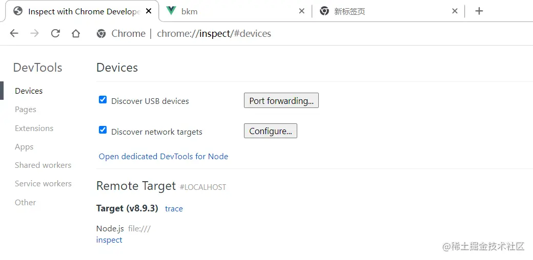 打开chrome浏览器,输入地址 chrome://inspect/#devices
