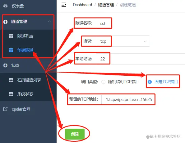 回到Ubuntu系统的cpolar客户端,在登录cpolar客户端后,点击主界面左侧“隧道管理”项下的“创建隧道”。并对这条隧道进行相应设置。其中隧道名称设定为ssh、协议选择为tcp、本地地址设定为端口22号、端口类型暂时设置为随机临时tcp端口。在设置完毕后,就可以点击下方的“创建”按钮,取得连接到Ubuntu系统的公网地址。