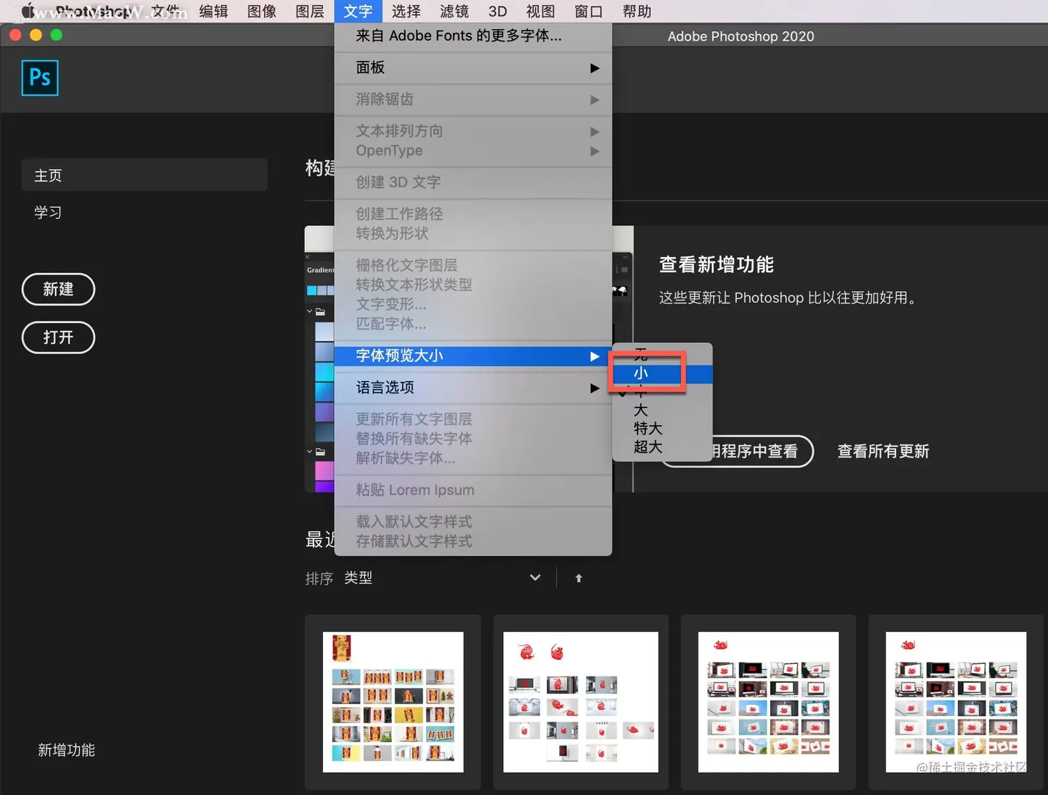 做设计难免会安装很多字体,但字体一多,文字工具就会出现卡顿。有一个办法可以解决这个问题,点击文字菜单→字体预览大小→小,既保留了字体预览功能,又能加快字体的加载速度。