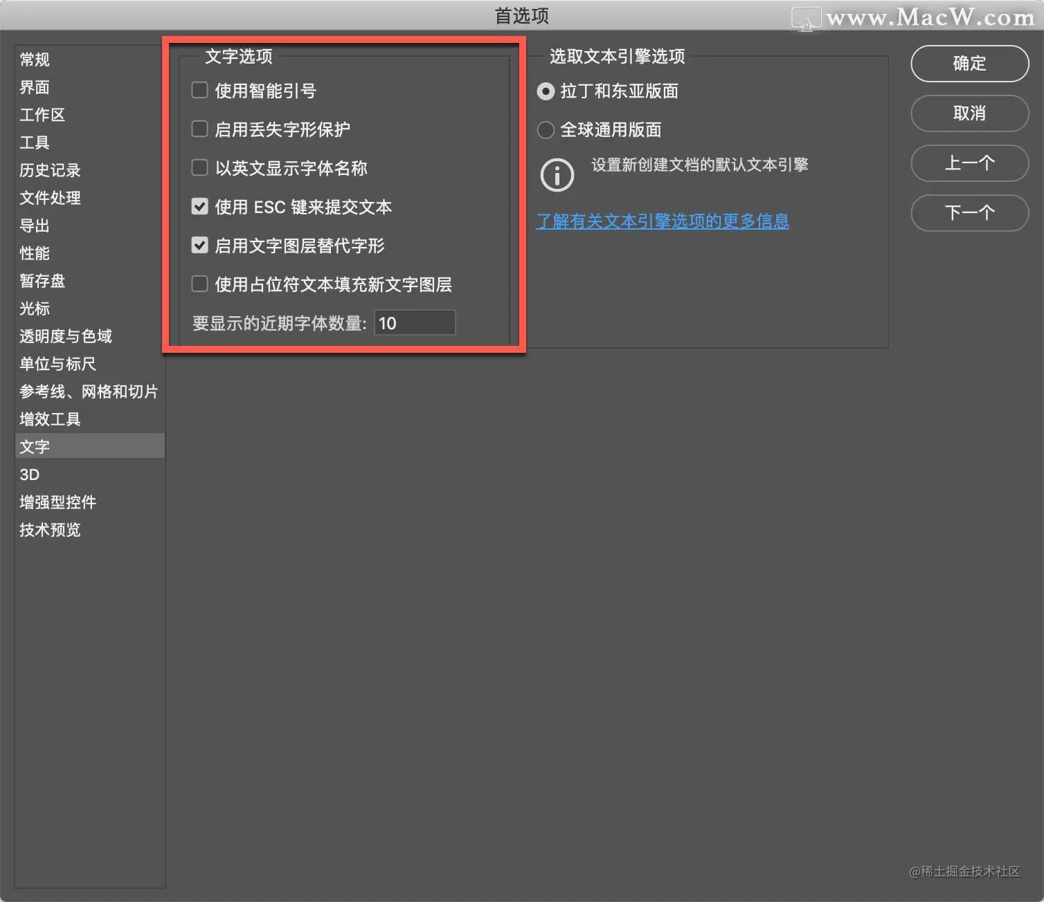 此外首选项里的文字也可以做一些设置,我个人一般只保留启用文字图层替代字形和使用占位符文本填充新文字图层两个选项,其他用途也不是很大,建议关闭。