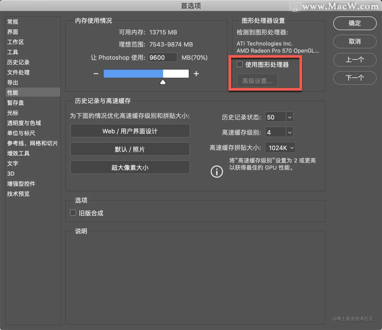 此外如果你感觉修改很多ps参数后依旧卡顿,可以试着关闭一下使用图形处理器,很多情况下会有奇效。