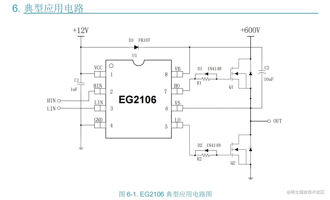 EG2106 的工作电压可达 600V,低端 Vcc 的电源电压范围宽 10V~20V。该芯片输入通道 HIN 内建了一个 200K 下拉电阻,LIN 内建了一个 200K 下拉电阻,在输入悬空时使上、下功率 MOS 管处于关闭状态,输出电流能力 IO+/- 0.3/0.6A,采用 SOP8 封装。3. 应用领域