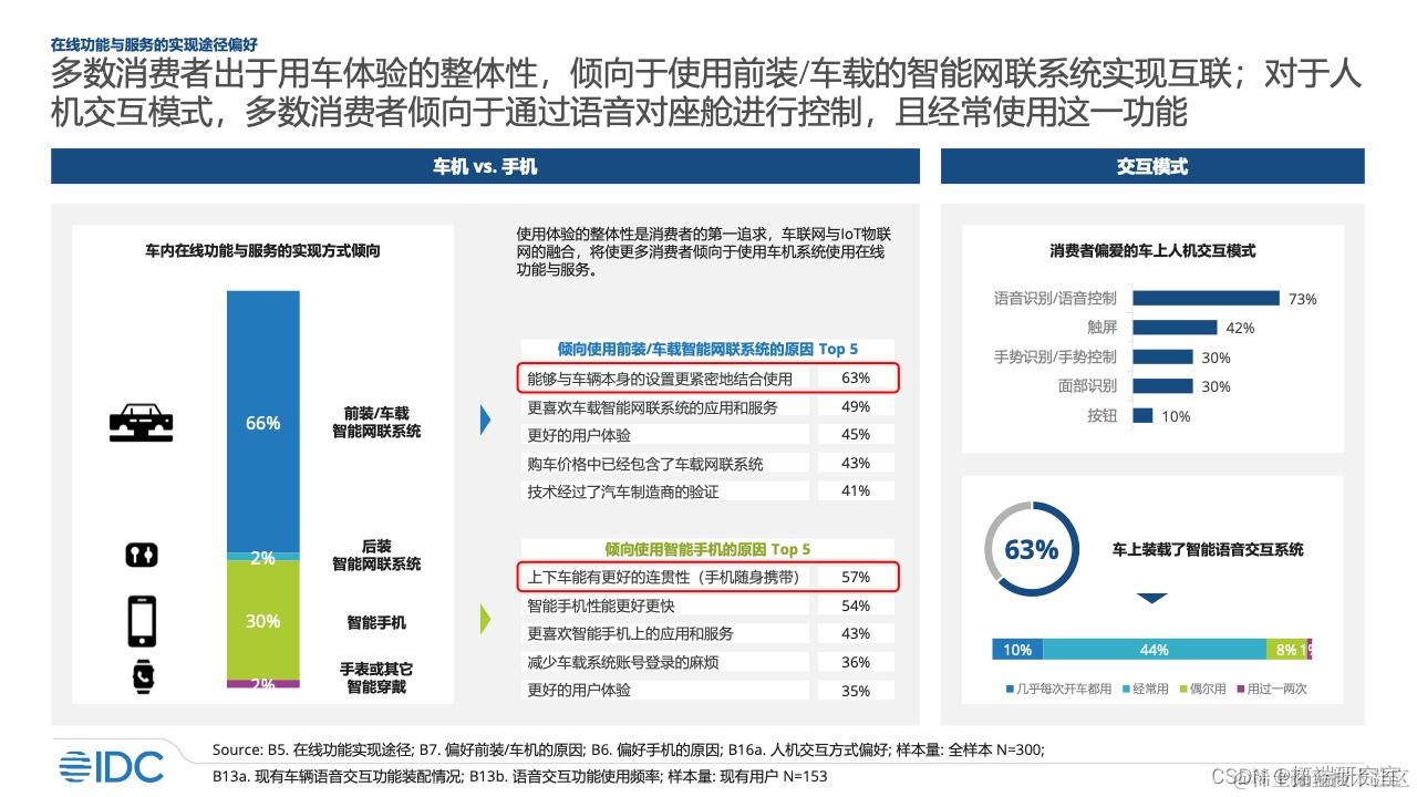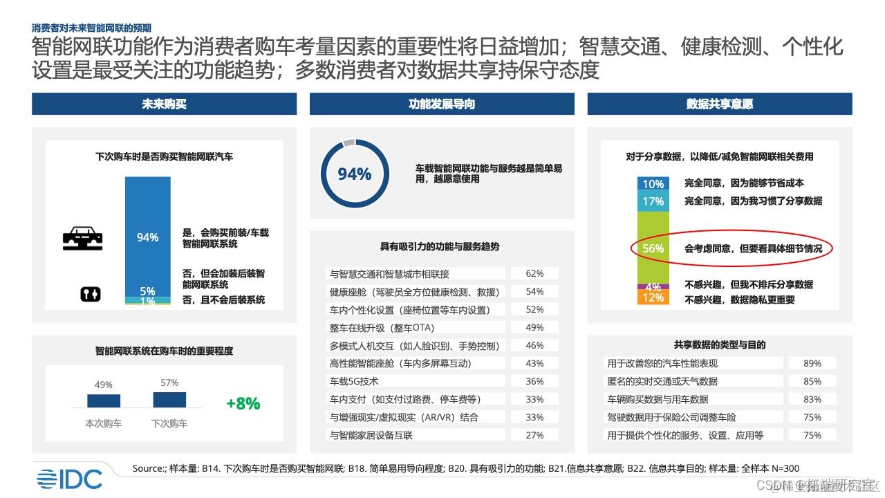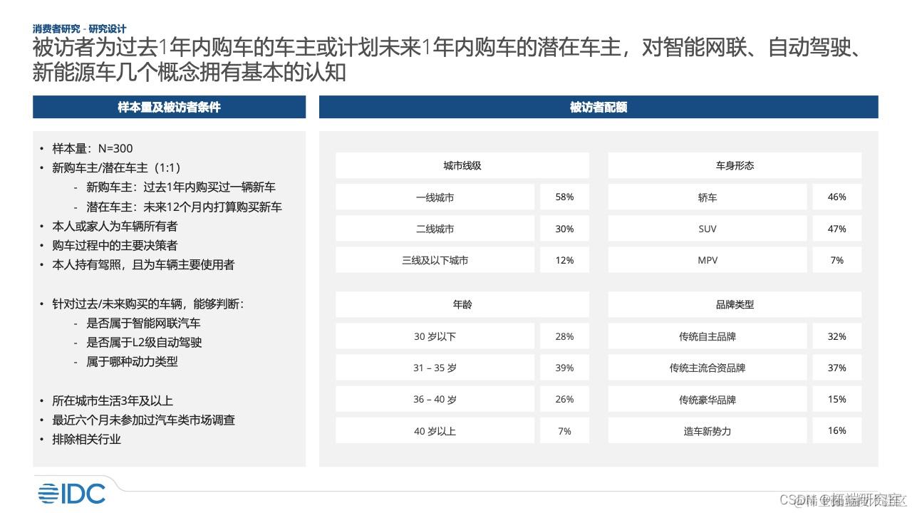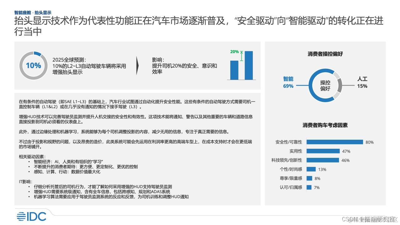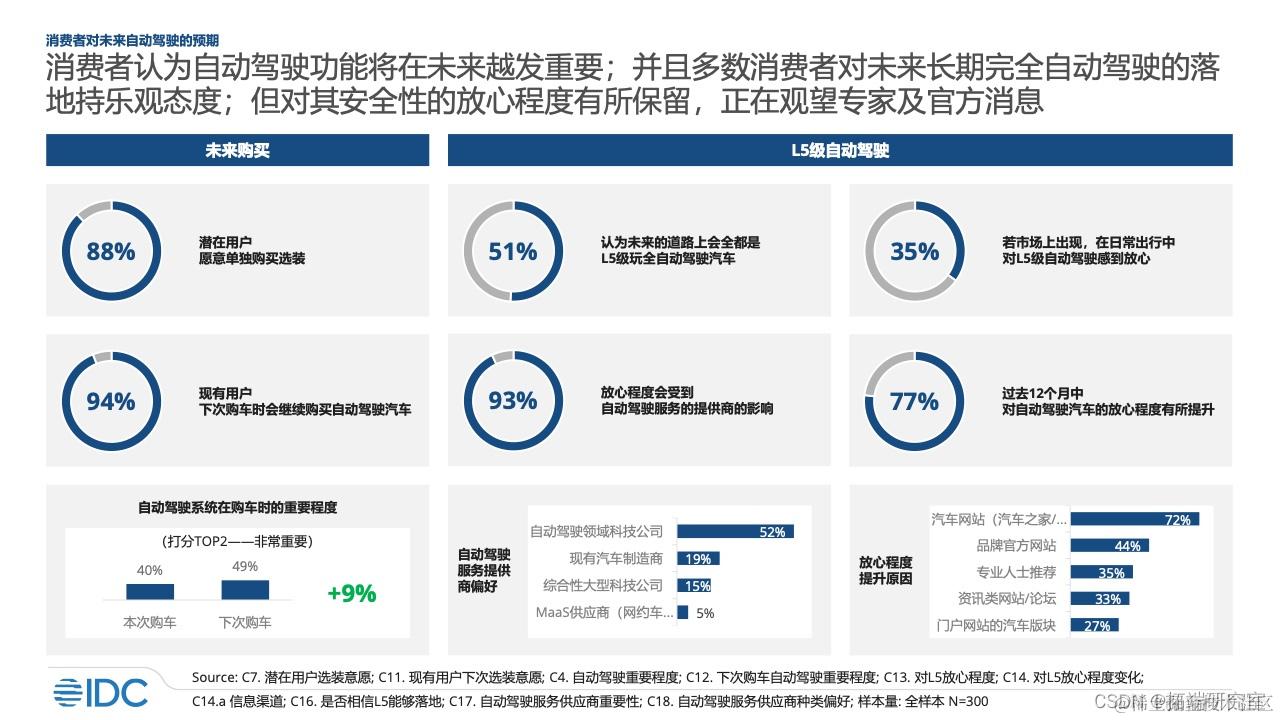 IDC将智能汽车市场定义为∶利用互联网、loT、人工智能、移动通信、云计算等技术,与汽车及交通基础设施相关的公司、产品和服务所组成的生态系统从需求端与供给端两个角度分析自动驾驶、新能源车、智能网联几个领域的发展现状被访者为过去1年内购车的车主或计划未来1年内购车的潜在车主,对智能网联、自动驾驶、新能源车几个概念拥有基本的认知自动泊车功能市场潜力巨大;同时,TA交通拥堵辅助虽然市场普及度不高,但使用过的消费者倾向于频繁使用这些功能消费者认为自动驾驶功能将在未来越发重要。