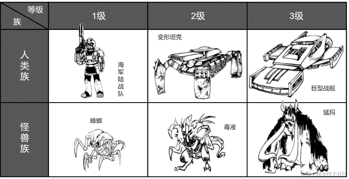 人类拥有各种军工高科技装备,而外星怪兽则靠血肉之躯与人类战斗,所以这两族的兵种必然有着巨大的差异,这就意味着各兵种首先应该按族划分。此外,从另一个角度来看,它们又有相同之处,2个族的兵种都可以被简单归纳为初级(1级)、中级(2级)、高级(3级)3个等级,如同之前对汽车品牌系列的规划一样,各族兵种也应当按等级划分,最终我们可以得到一个对所有兵种分类归纳的表格