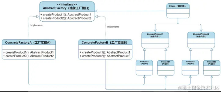 ProductA1、ProductB1、ProductA2、ProductB2(产品A1、产品B1、产品A2、产品B2):继承自抽象产品的产品实体类,其中ProductA1与ProductB1代表A族产品与B族产品的同一产品系列,类似于本章例程中人类族与外星怪兽族的初级兵种,之后的产品实体类以此类推。