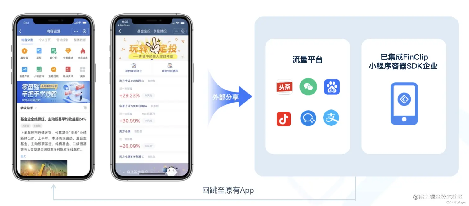 还有一点,在 FinClip 完成任一业务小程序开发后,不止可以生长运行于自有 App 中,同时小程序语法兼容各大流量平台,能够更加便捷的在社交平台中进行裂变分享,促进基于业务场景的交流,实现跨平台获客,此外支持小程序回跳 App ,为 App 引流。