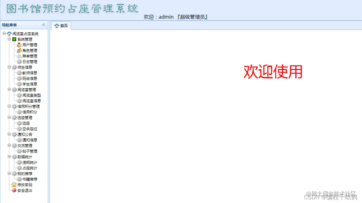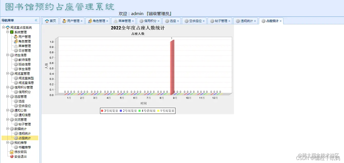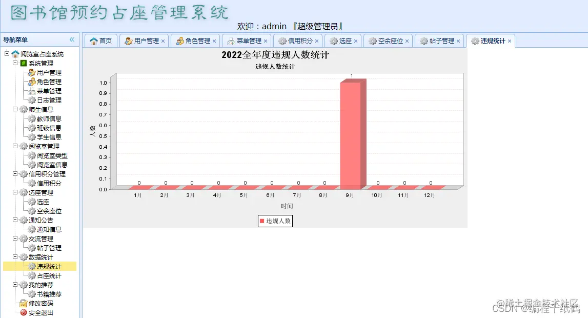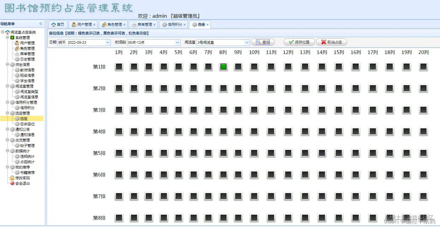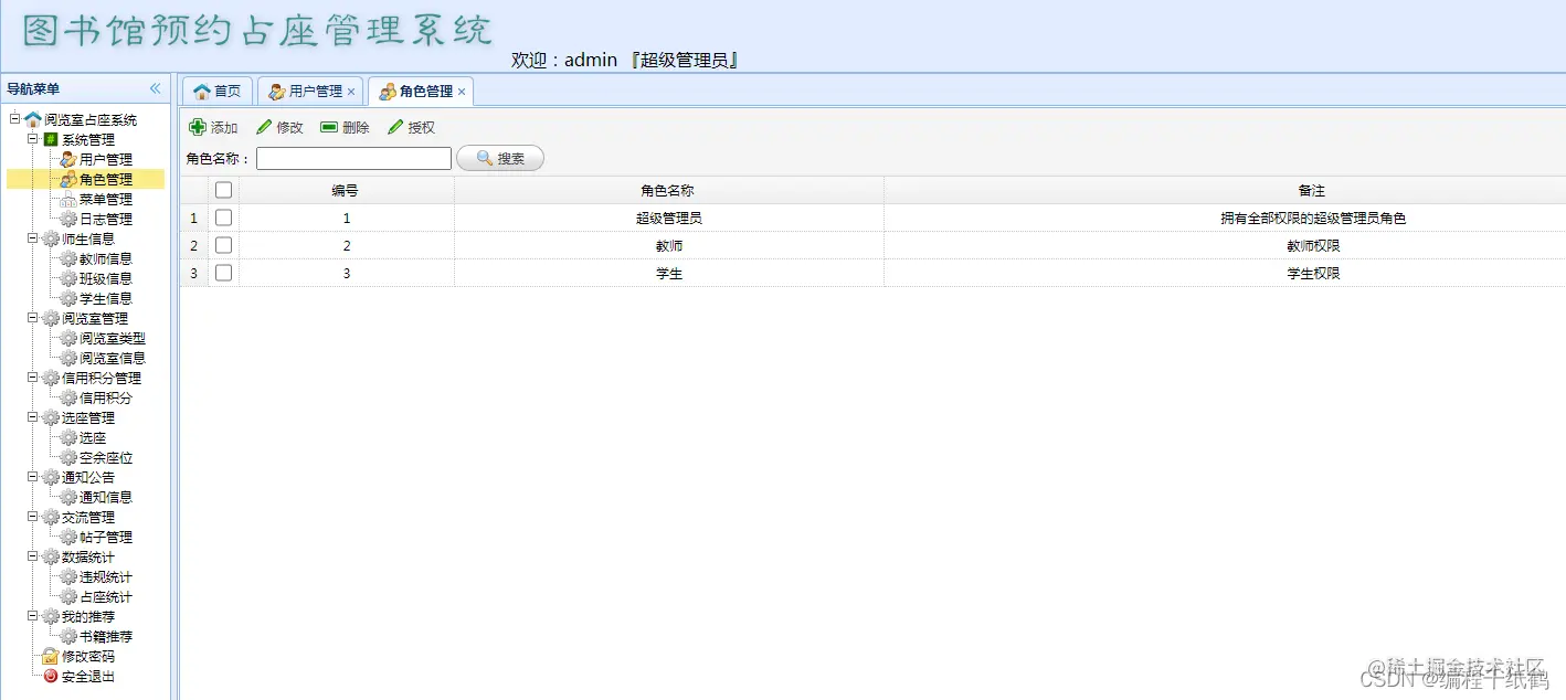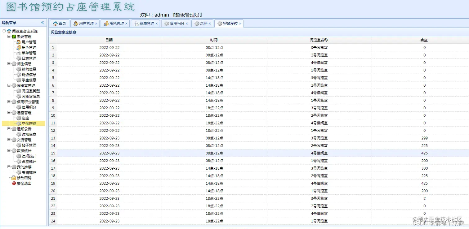 用户管理、菜单管理、角色管理、权限管理、学生管理、教师管理、班级管理、图书馆阅览室管理、学生信用管理、预约占座管理、发帖评论管理、违规统计、占座预约统计等,添加学生和教师时会自动在用户表中注册,定时任务会定时生成座位信息,阅览室分类中可设置信用等级,学生被扣分后信用等级低于相应的值后不能预约相应的阅览室座位。