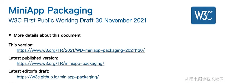 就在去年 11 月 30 日,W3C MiniApps 工作组发布 MiniApp Packaging 规范的首个公开工作草案,并计划将其最终发布为 W3C 正式推荐标准。