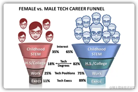 作为一种统计图表,漏斗图的“长相”,本质上是由数据决定的。梯形的高度、面积都是有意义的,不应想当然的篡改。以下图为例,本意是想表现男性和女性在 STEM 领域的表现差异,但是漏斗的形状与实际的数据完全对不上。