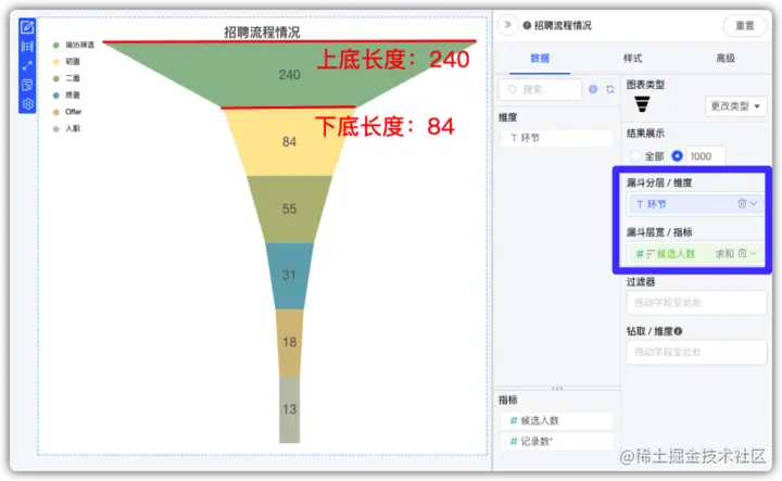 使用漏斗图展示如下所示,能够清晰的观察到在招聘的各个环节中人员数量的变化情况。
