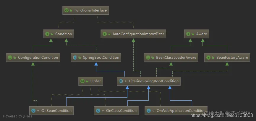 这里注解点进去看会发现每个注解上都标注了@Conditional注解,并且value值都对应一个类,比如OnBeanCondition,而这些类都实现了Condition接口,看看其继承体系: