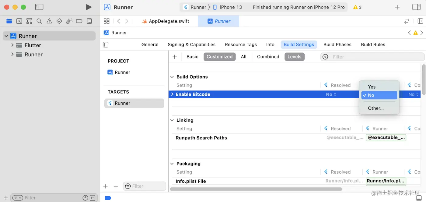 你可以打开 ios/Runner.xcworkspace 并在 build setting 中将 Enable Bitcode 设置为 No 以关闭它。混合开发应用可以在宿主工程的 Xcode 项目中关闭它。