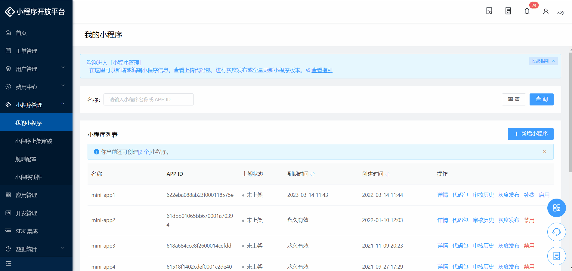 代码包管理的主体对象是小程序,因此在最开始,我们需要将自己需要开发和管理的小程序,在后台创建出来。