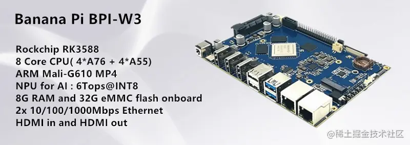 香蕉派(Banana Pi ) BPI-W3 是一款性能强大的NAS路由开发板,采用瑞芯微( Rochchip) RK3588 8核处理器开发(4核 ARM Cortex-A76 加 4核 Cortex-A55 ,支持6Tops@INT8 NPU ,板载8G LPDDR4 内存,32G eMMC 存储 .支持多种操作系统,像 OpenWrt, Android 和linux. 板上有2个千兆网口, 2路HDMI输出(HDMI out)和1路HDMI高清视频输入(HDMI in).