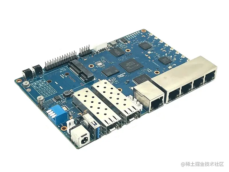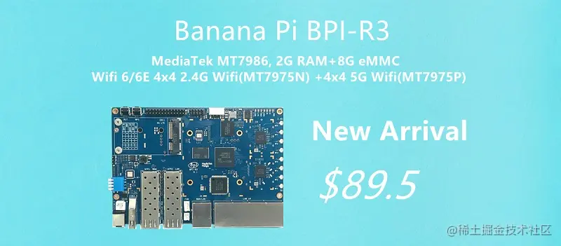 香蕉派BPI-R3开源路由器开发板采用联发科MT7986 (Filogic 830)四核 ARMA53 + MT7531A芯片设计,板载2G DDR内存与8G eMMC存储,这是一个非常高性能开源路由器开发板,支持WIFI 6/6E, 2.4G Wifi无线使用MT7975N芯片, 5G Wifi使用MT7975P芯片,支持2 SFP光通信接口 ,5个千兆网口。
